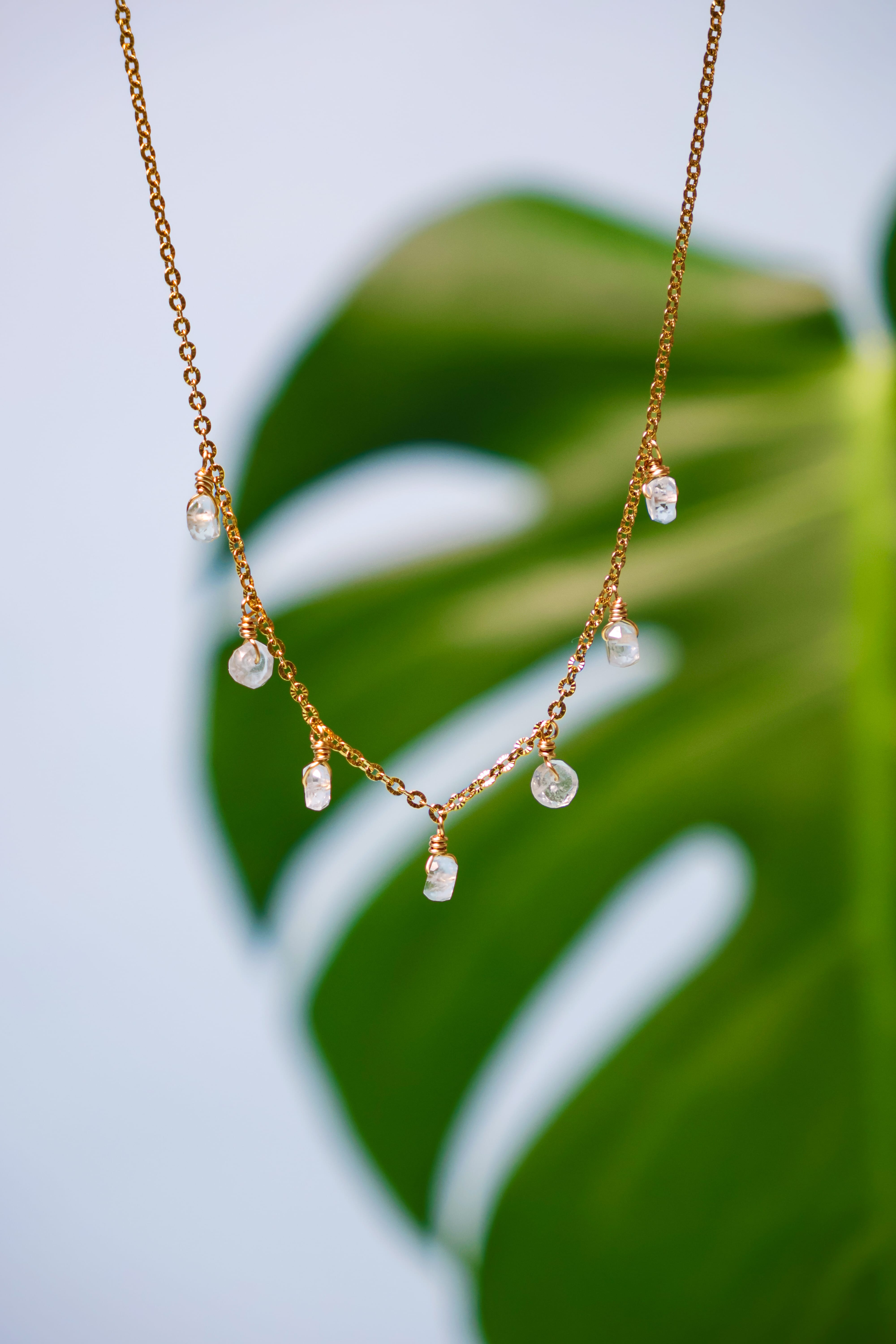 Um colar curto e delicado que evoca pequenas gotas de água a cair. Com sete Águas-Marinhas em forma de gota, esta peça cria um movimento subtil e luminoso junto ao colo. Pensado para ser usado sozinho ou como complemento perfeito do Colar Harmonia Azul.